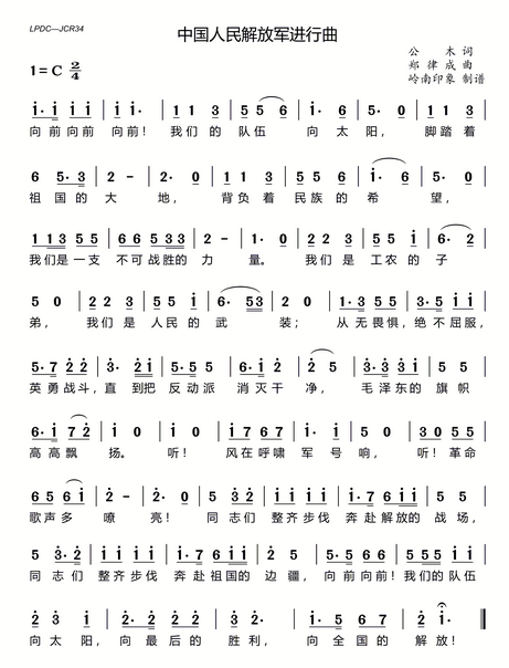 中國人民解放軍軍歌,歌名為《中國人民解放軍進行曲》,由公木作詞,鄭律成作曲,創作于1939年。